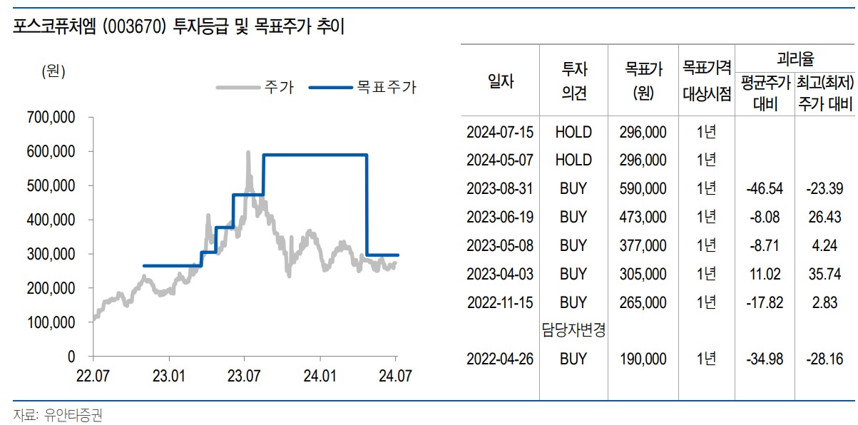 포스코퓨처엠의 주가는 향후 긍정적인 흐름이 예상됨. 에너지소재 부문의 성장과 신규 공장 가동이 매출 증대에 기여할 것으로 보임. 목표주가는 296,000원으로 설정되었으며, 이는 현재 주가 대비 약 8%의 상승 여력이 있음.
