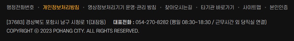 포항시청은 군민들이 필요로 하는 다양한 행정 서비스를 제공하며, 민원 처리, 서류 발급, 복지 서비스 등을 지원하고 있습니다. 군청 홈페이지를 통해 최신 공지사항과 정책 정보를 쉽게 확인할 수 있으며, 온라인 민원 처리를 통해 비대면으로도 필요한 업무를 처리할 수 있습니다. 포항시청은 주민들이 더 나은 삶을 누릴 수 있도록 항상 최선을 다하고 있습니다.