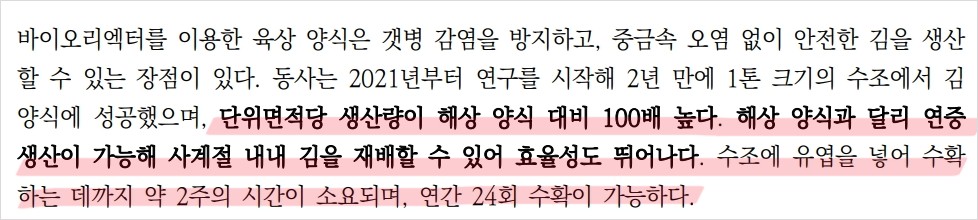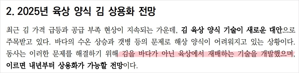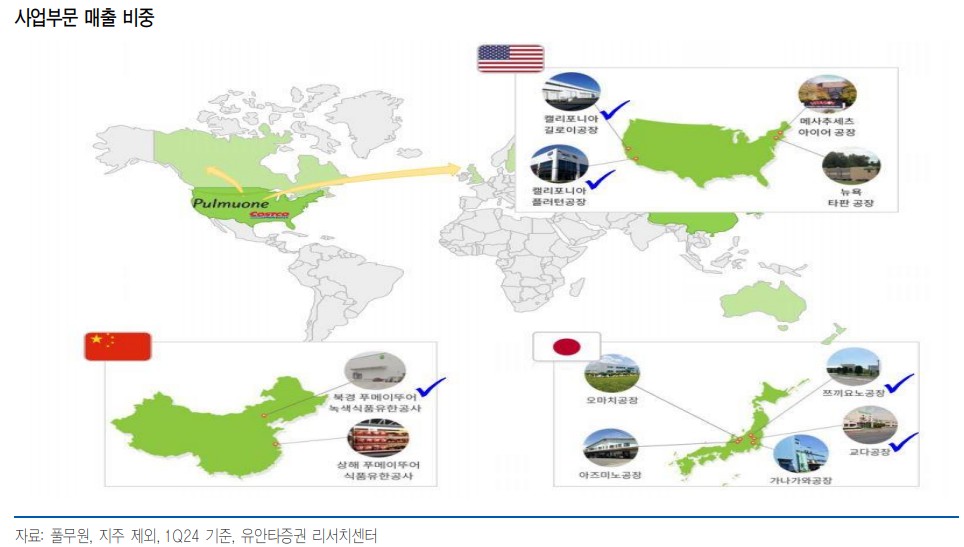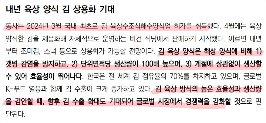 풀무원은 최근 미국, 일본, 중국 등의 해외 법인에서 실적 턴어라운드를 기대하고 있음. 미국에서는 두부와 아시안 푸드의 매출 성장이 주도하고 있으며, 일본에서는 두부바 매출 비중 확대와 주력 제품 가격 인상을 통해 흑자 전환이 예상됨. 중국에서는 유통 채널 재개와 생산 능력 확대로 수익성이 개선될 것으로 보임. 또한, 2024년 3월 국내 최초로 김 육상수조식해수양식업 허가를 취득하여 김의 상용화를 추진 중임. 이는 김 생산의 효율성을 높이고, 글로벌 시장에서 경쟁력을 강화할 것으로 기대됨.