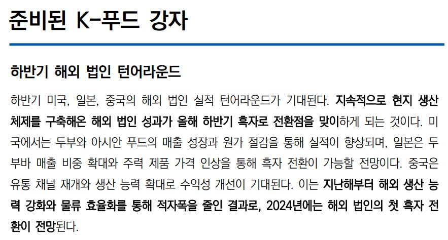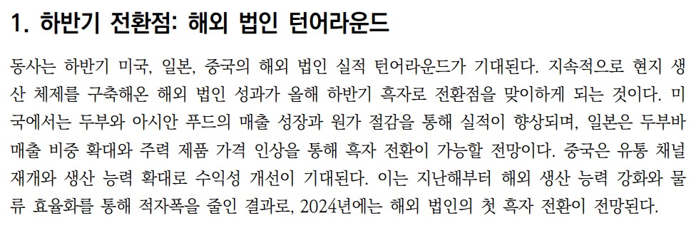 - 미국: 두부 및 아시안 푸드의 매출 성장과 원가 절감을 통해 실적 향상