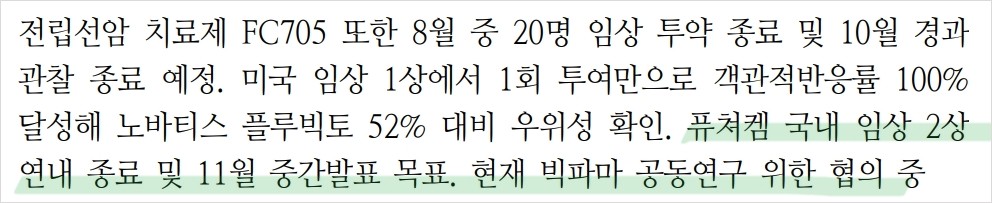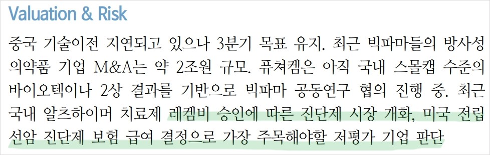 퓨처켐은 최근 전립선암 진단제 FC303의 식약처 허가 신청을 준비 중이며, 전립선암 치료제 FC705는 국내 임상 2상을 연내 종료할 예정임. 또한, 미국 CMS의 전립선암 진단제 개별 급여 적용 발표로 인해 퓨처켐의 FC303과 FC705 모두 긍정적인 영향을 받을 것으로 예상됨. 퓨처켐은 전립선암 진단제와 치료제 시장에서 중요한 위치를 차지하고 있음. 중국 기술이전이 지연되고 있으나, 3분기 내 본계약 체결을 목표로 하고 있으며, 이는 퓨처켐의 재무 상황 개선에 큰 도움이 될 것임.