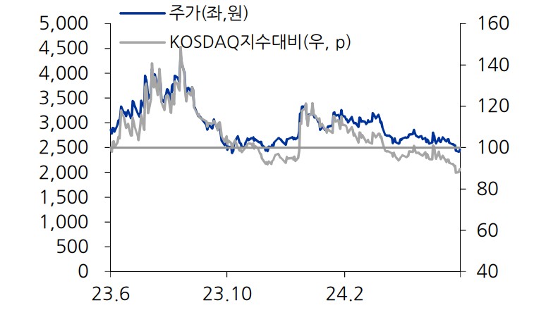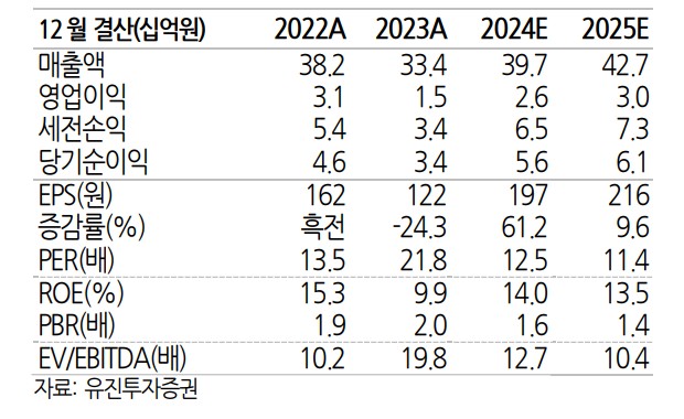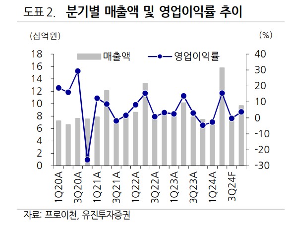프로이천의 재무 상황은 안정적임. 2021년부터 2023년까지 매출액은 38.2십억원에서 33.4십억원으로 감소했으나, 2024년에는 39.7십억원으로 증가할 것으로 예상됨. 영업이익은 2021년 3.1십억원에서 2023년 1.5십억원으로 감소했으나, 2024년에는 2.6십억원으로 회복될 전망임. 부채비율은 2021년 200% 수준으로 양호하며, PER은 2024년 12.5배로 유사업체 대비 할인되어 거래 중임.