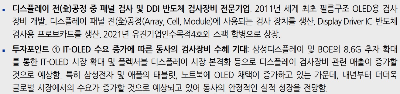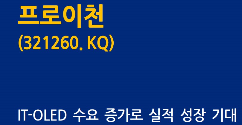 프로이천은 디스플레이 전 공정 중 패널 검사 및 DDI 반도체 검사장비 전문기업으로, 2011년 세계 최초 필름구조 OLED용 검사장비를 개발한 기업임. 삼성디스플레이 및 BOE의 8.6G 투자를 통한 IT-OLED 시장 확대와 플렉서블 디스플레이 시장의 본격화로 인해, 프로이천의 검사장비 매출이 증가할 것으로 예상됨. 2021년 유진기업인수목적4호와 스팩 합병으로 상장하였으며, 주로 삼성전자 및 애플의 태블릿, 노트북에 OLED 채택이 증가하고 있음. 이로 인해 글로벌 시장에서의 수요가 증가할 것으로 전망됨.