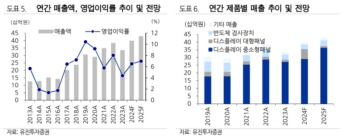 프로이천은 디스플레이와 반도체 검사장비 분야에서 독보적인 기술력을 바탕으로 성장하고 있음. 주요 매출처는 삼성디스플레이, LG 디스플레이, BOE 등으로 안정적인 매출을 올리고 있음. 2023년 매출액은 33.4십억원, 영업이익은 1.5십억원으로 집계됨. 신규 제품 개발과 글로벌 시장 확대를 통해 2024년에는 매출액 39.7십억원, 영업이익 2.6십억원을 목표로 하고 있음. 특히, IT-OLED 수요 증가가 지속 될 것으로 전망됨.