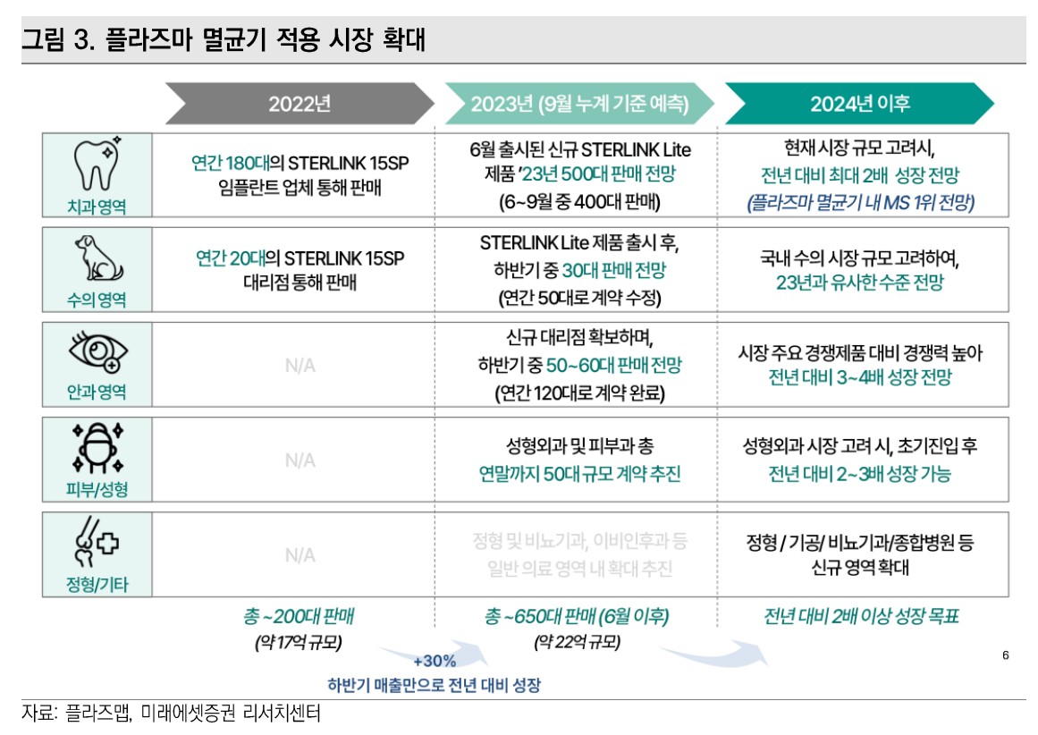플라즈맵의 목표주가는 45,000원으로 설정함. 이는 Sterlink 및 Plasmapp 제품의 글로벌 시장 확장과 신규 제품 출시, 유럽 CE 인증 및 북미 FDA 승인에 따른 판매 호조를 고려한 수치임. 향후 글로벌 시장 진출 확대와 신규 제품 출시가 목표주가 달성에 기여할 것으로 예상됨.