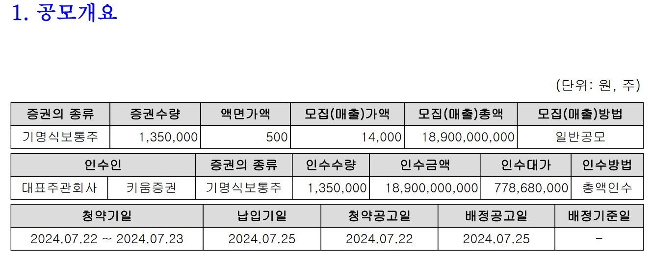 피앤에스미캐닉스는 이번 공모를 통해 총 1,350,000주의 신주를 발행할 예정임. 상장 주관사는 키움증권으로, 수요 예측은 2024년 7월 22일부터 23일까지, 청약기일은 2024년 7월 25일에 진행됨. 공모가격은 14,000원에서 17,000원 사이로 책정될 예정임. 이번 공모를 통해 모집된 자금은 회사의 성장과 발전을 위해 전략적으로 사용될 계획임.