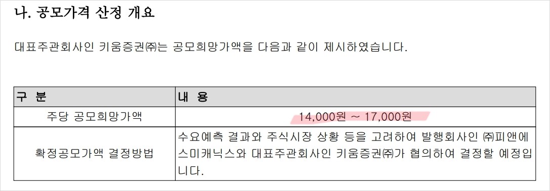 | 공모가격(희망공모가액) | 14,000~17,000원 |