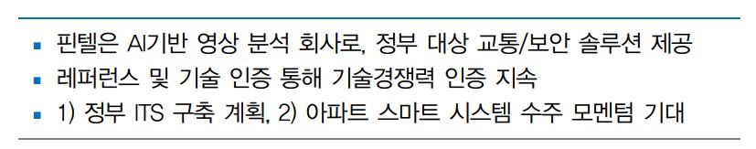 핀텔은 AI 기반 영상 분석 솔루션 시장에서 강력한 기술력을 바탕으로 성장하고 있음. 최근의 주가 하락에도 불구하고, 정부의 ITS 구축 사업 및 아파트 스마트 시스템 수주 모멘텀이 기대됨. 투자에 있어서는 이러한 점을 고려하여 신중한 접근이 필요함.
