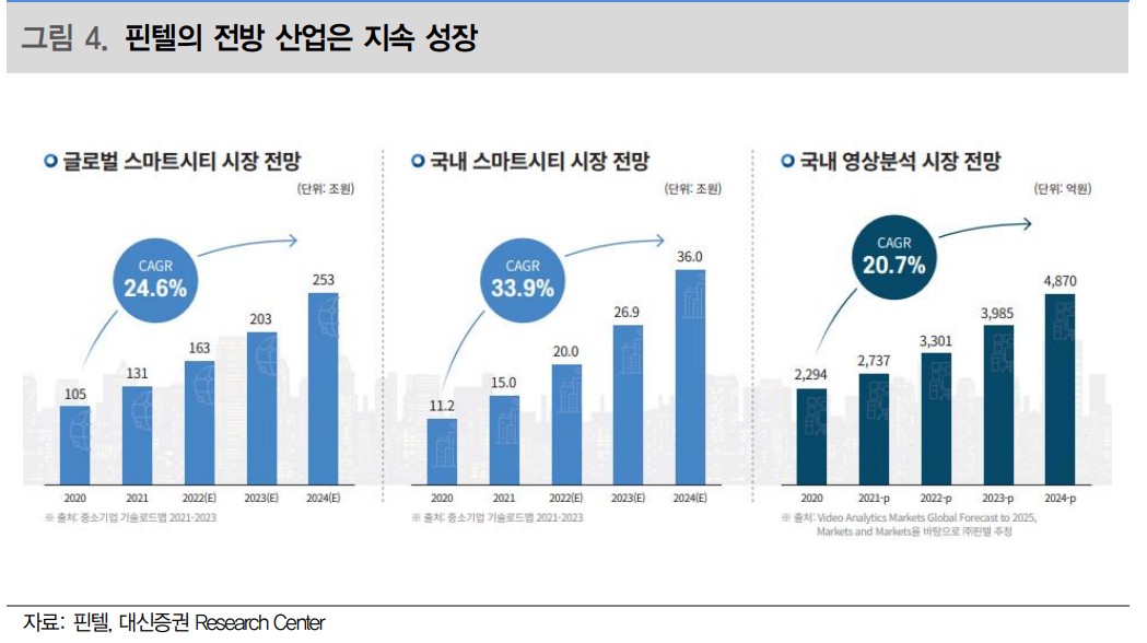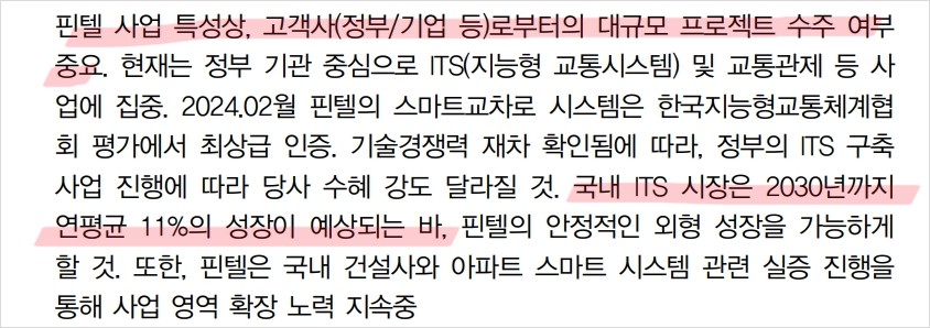 핀텔은 최근 강소형 스마트시티 조성사업 등으로 사업 영역을 확장하고 있음. 스마트교차로 시스템은 한국지능형교통체계협회에서 최상급 인증을 받았으며, 이는 정부의 ITS 구축 사업 진행에 따라 핀텔이 수혜를 입을 가능성을 높임. 국내 ITS 시장은 2030년까지 연평균 11% 성장할 것으로 전망됨.
