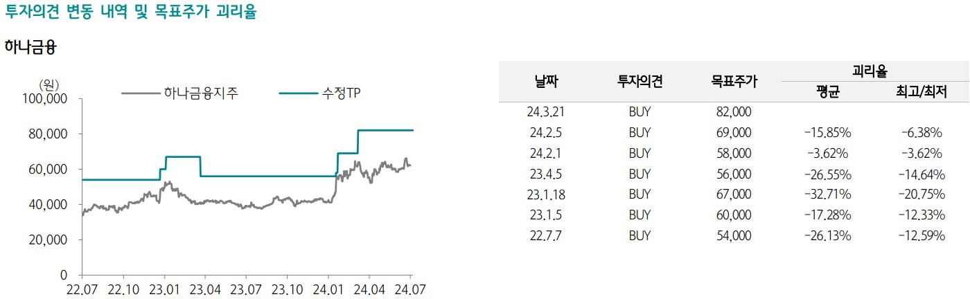 하나금융지주 주가는 향후 고성장과 비이자이익 개선에 따라 상승할 것으로 전망됨. 2024년 목표 주가는 82,000원으로 설정되었으며, 현재 주가 대비 약 32.3% 상승 여력이 있음. 고성장과 리스크 관리가 주가 상승의 주요 요인으로 작용할 것임.
