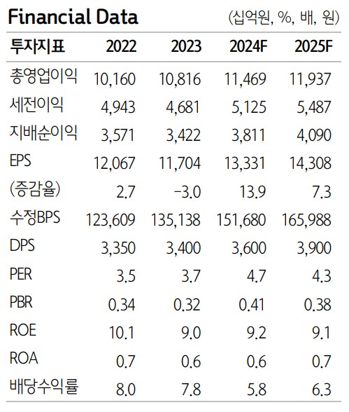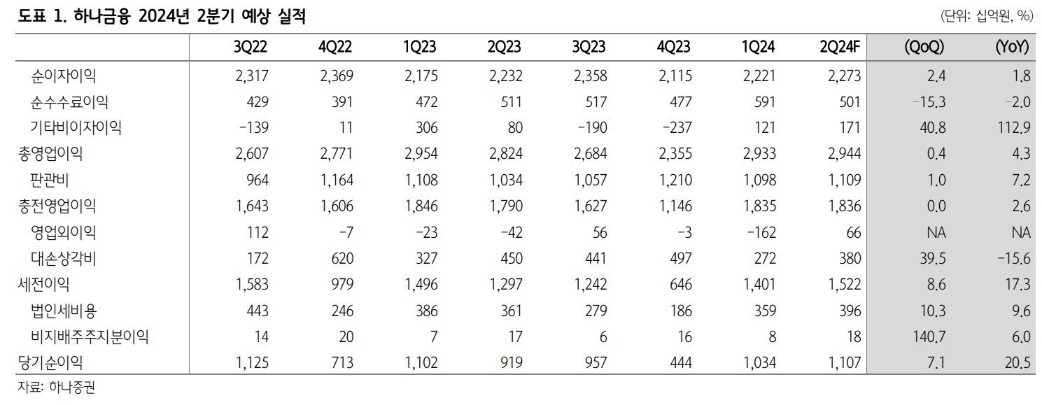 하나금융지주는 다양한 금융 서비스를 제공하는 기업으로, 2분기 추정 순익은 약 1.1조원으로 컨센서스를 상회하는 양호한 실적이 예상됨. PF 관련 추가 충당금 규모가 약 600~700억원 내외로 대손비용률 상승 폭이 제한적. 홍콩 H지수 상승으로 기인식 ELS 손실 중 약 500~600억원 내외의 환입이 있을 것으로 추정됨. 원/달러 환율 상승에 따른 외화환산손실 발생이 예상되지만, 시중금리 하락에 따른 유가증권 관련익이 커질 것으로 전망됨. 목표주가는 82,000원으로 유지됨.