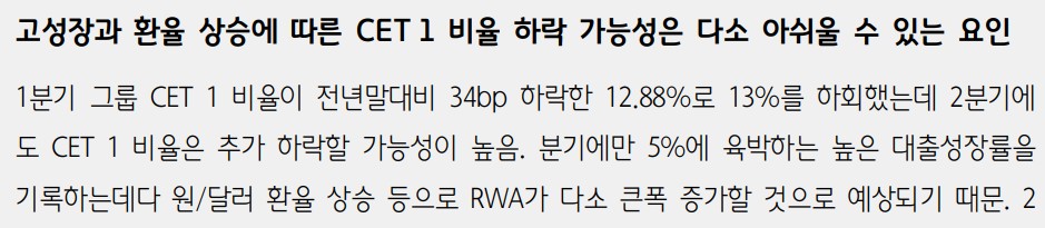 하나금융지주는 2분기 중 높은 대출성장률로 인해 NIM이 전분기 대비 약 7~8bp 하락할 것으로 예상됨. 그러나 고성장에 따른 이자수익자산 확대로 순이자이익은 증가 추세를 지속할 전망. 2023년 순익 3.4조원 대비 약 11% 이상 증익이 기대됨. CET 1 비율은 상반기 대출성장률로 인해 하락 가능성이 높지만, 하반기에는 리스크 관리 차원에서 성장률이 둔화될 것으로 보임. 3분기 결산 후 자사주 추가 매입·소각이 예상됨. 올해 순익 증가로 배당성향은 다소 낮아질 수 있음.