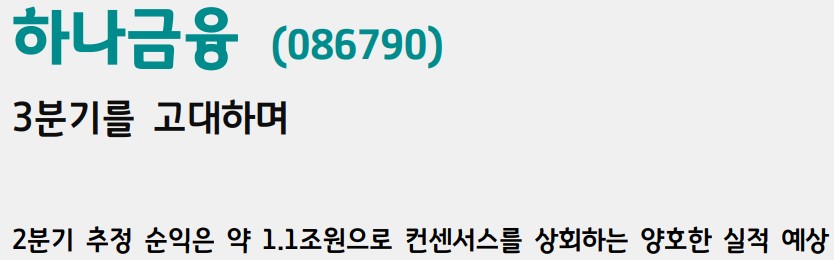 하나금융지주는 다양한 금융 서비스를 제공하는 기업으로, 2분기 추정 순익은 약 1.1조원으로 컨센서스를 상회하는 양호한 실적이 예상됨. PF 관련 추가 충당금 규모가 약 600~700억원 내외로 대손비용률 상승 폭이 제한적. 홍콩 H지수 상승으로 기인식 ELS 손실 중 약 500~600억원 내외의 환입이 있을 것으로 추정됨. 원/달러 환율 상승에 따른 외화환산손실 발생이 예상되지만, 시중금리 하락에 따른 유가증권 관련익이 커질 것으로 전망됨. 목표주가는 82,000원으로 유지됨.