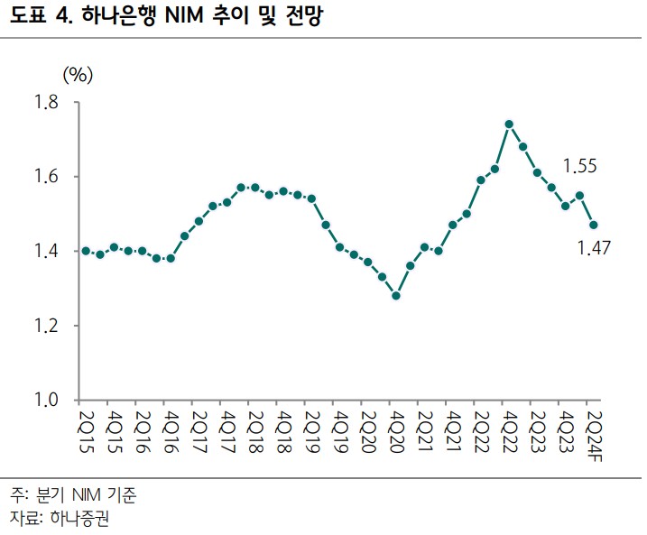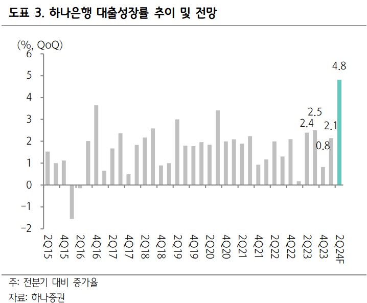 하나금융지주는 2분기 중 높은 대출성장률로 인해 NIM이 전분기 대비 약 7~8bp 하락할 것으로 예상됨. 그러나 고성장에 따른 이자수익자산 확대로 순이자이익은 증가 추세를 지속할 전망. 2023년 순익 3.4조원 대비 약 11% 이상 증익이 기대됨. CET 1 비율은 상반기 대출성장률로 인해 하락 가능성이 높지만, 하반기에는 리스크 관리 차원에서 성장률이 둔화될 것으로 보임. 3분기 결산 후 자사주 추가 매입·소각이 예상됨. 올해 순익 증가로 배당성향은 다소 낮아질 수 있음.