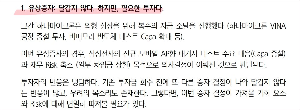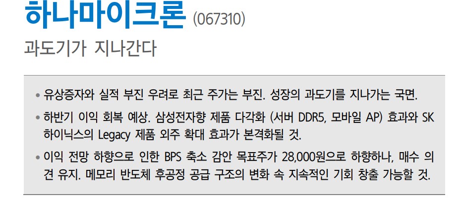 하나마이크론은 최근 유상증자를 발표하며 주가가 하락했으나, 이는 필요한 투자로 평가됨. 삼성전자와의 협력을 통해 신규 모바일 AP향 패키지 테스트 수요를 대응하고 있으며, SK하이닉스의 Legacy 제품 외주 확대가 예상됨. 또한, 서버 DDR5 제품 다변화가 진행 중이며, 하반기부터 이익 회복이 예상됨. 이러한 이슈들은 향후 하나마이크론의 매출 증가와 주가 상승에 긍정적인 영향을 미칠 것으로 예상됨.