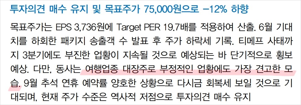 하나투어는 티메프 사태와 같은 단기적 악재에도 불구하고, 9월 추석 연휴와 같은 성수기를 기점으로 회복세가 기대됨. 견고한 시장 지위와 다양한 상품 구성을 통해 장기적인 성장이 예상됨.