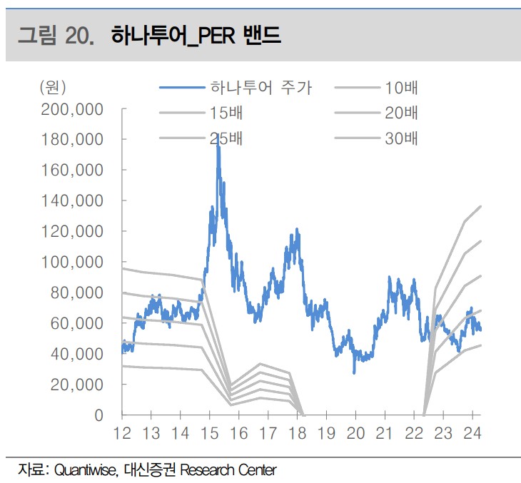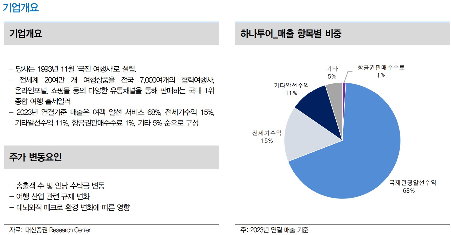 하나투어는 국내 최대 여행 홀세일러로서, 전세계 다양한 여행상품을 제공하며, 견고한 시장 지위를 유지하고 있음. 최근 티메프 사태와 같은 부정적 이슈에도 불구하고, 회복 가능성이 높아 보임.