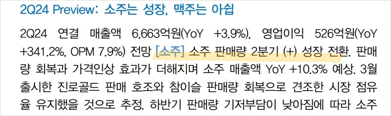 - 소주 판매량 회복: 가격 인상 효과와 함께 매출액 증가