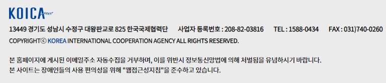 한국국제협력단(KOICA)은 한국 정부의 국제 개발 협력 전문 기관으로, 전 세계의 개발도상국과 협력하여 지속 가능한 발전을 지원합니다. KOICA는 교육, 보건, 인프라 등 다양한 분야에서 국제 협력 프로젝트를 통해 글로벌 사회에 기여하고 있습니다.