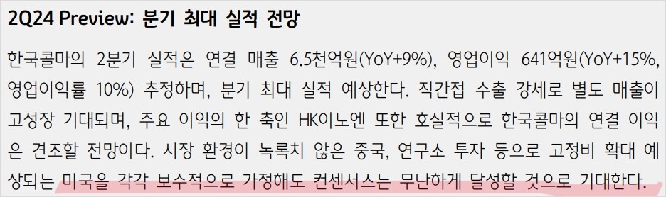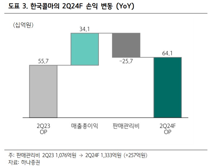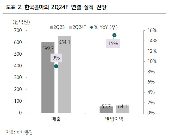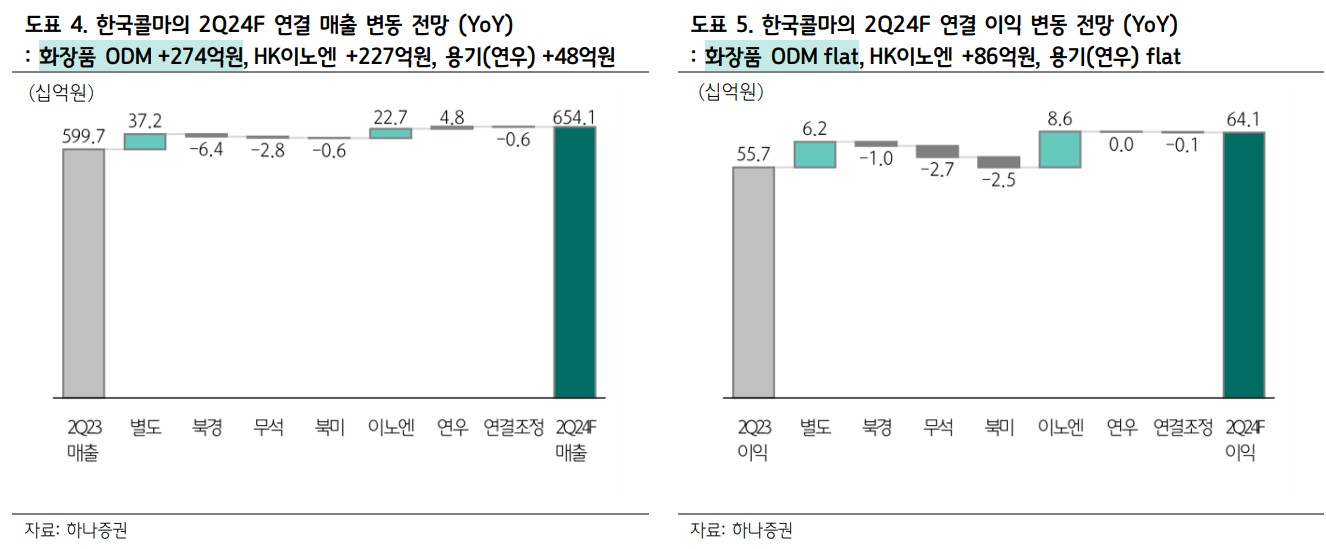 한국콜마는 2024년 2분기에 연결 매출 6,541억 원, 영업이익 641억 원을 기록할 것으로 예상됨. 이는 전년 동기 대비 각각 9%, 15% 증가한 수치로, 국내외 ODM 매출 증가와 주요 자회사 HK이노엔의 호실적 덕분임. 한국콜마의 국내 ODM은 매출 2,900억 원, 영업이익 408억 원을 예상하며, 선제품의 국내외 수요 확대로 분기 최대 실적을 기대하고 있음.