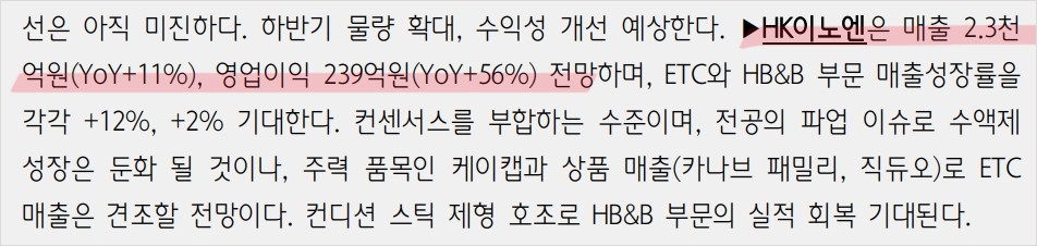 한국콜마는 2024년 전체 매출액 2조 5,000억 원, 영업이익 2,000억 원을 기록할 것으로 예상됨. 국내외 ODM 매출이 크게 증가하며, 주요 자회사 HK이노엔의 실적 호조가 연결 이익에 기여함. 또한, 용기 사업부 연우의 수주 개선과 글로벌 고객사 추가로 외형 증가가 기대됨.