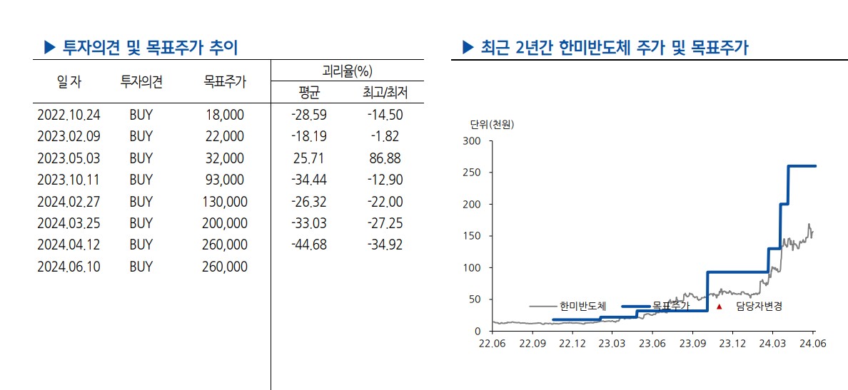 한미반도체의 목표주가는 260,000원으로 설정됨. 이는 현재 주가 대비 약 65.8%의 상승 여력을 의미함. 한미반도체의 지속적인 성장 가능성을 반영한 목표주가임.