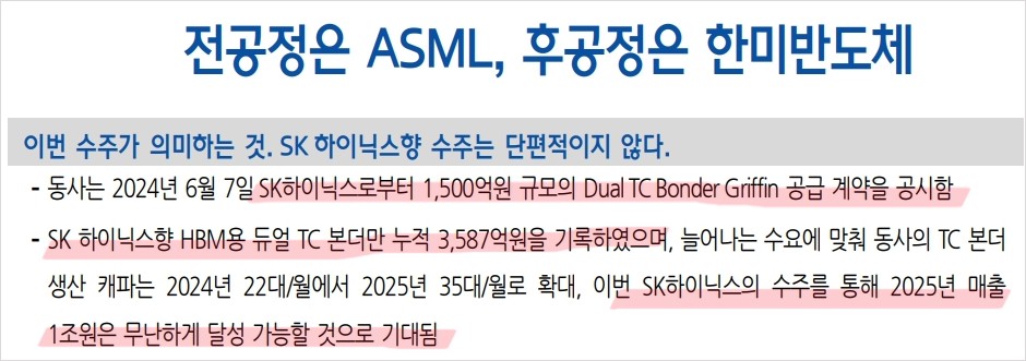 한미반도체는 SK하이닉스와의 대규모 계약을 통해 HBM 시장에서 강력한 입지를 확인했으며, 이는 향후 성장 가능성을 크게 높여줄 것으로 기대됨. 기술적 분석에서는 상승 추세가 지속되고 있으며, 기본적 분석에서도 안정적인 재무구조와 성장성을 확인할 수 있음. 향후 주가 전망은 매우 긍정적으로 평가됨. HBM 시장에서의 기술적 우위와 글로벌 장비업체로서의 입지 강화를 통해 지속적인 성장 가능성이 높음.