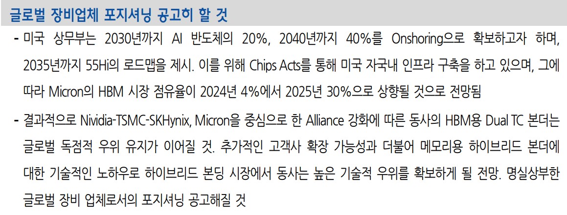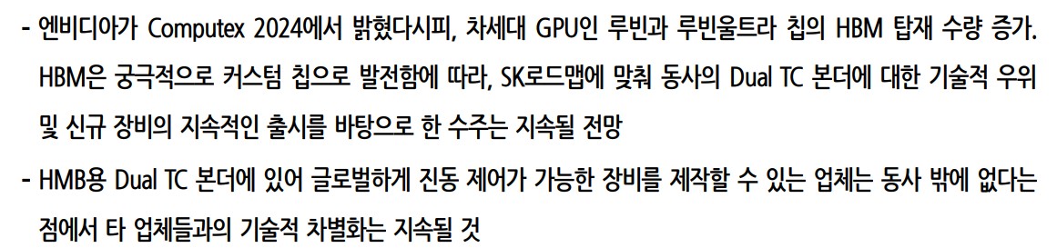 한미반도체는 SK하이닉스와의 대규모 계약을 통해 HBM(고대역폭 메모리) 시장에서의 강력한 입지를 다시 한번 확인했음. 이번 계약은 SK하이닉스가 HBM3E, HBM4 등의 차세대 메모리 제품 생산을 위해 한미반도체의 Dual TC Bonder를 선택한 것으로, 이는 향후 AI 및 데이터 센터 시장의 성장과 맞물려 큰 수익을 창출할 것으로 기대됨. 또한, NVIDIA와 TSMC와의 협력 강화를 통해 AI 시장에서도 높은 성과를 기대할 수 있음.