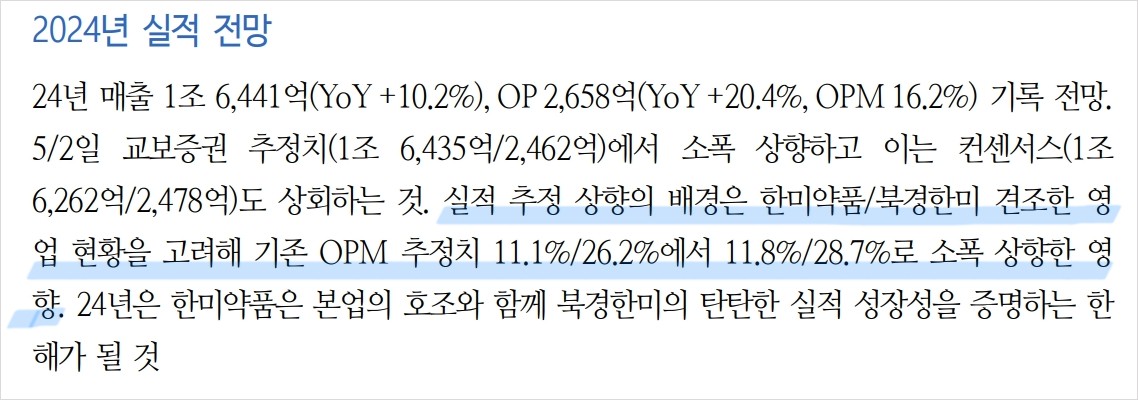 한미약품은 2024년 2분기에도 좋은 실적을 기록할 것으로 보임. 주요 R&D 프로젝트인 LA트리아와 MASH 치료제의 임상이 순조롭게 진행 중이며, 북경한미와 정밀화학 사업부의 성장도 지속되고 있음. 특히 북경한미의 영업 호조가 두드러짐. 또한, 2024년 전체 매출과 영업이익이 각각 1조 6,441억 원과 2,658억 원으로 예상되어 실적 향상이 기대됨. 미국 1상 임상 결과는 내년 초 발표될 예정.