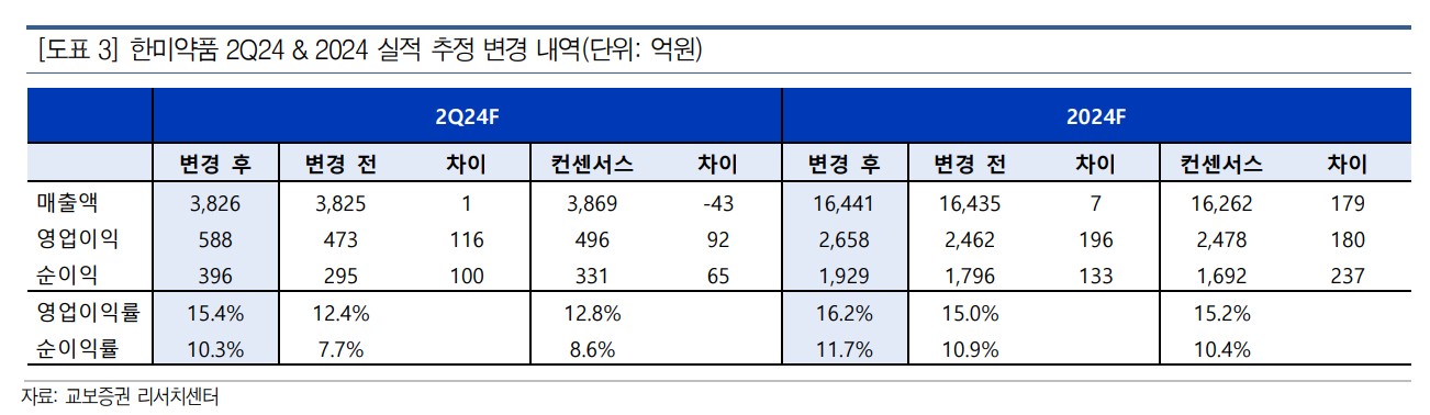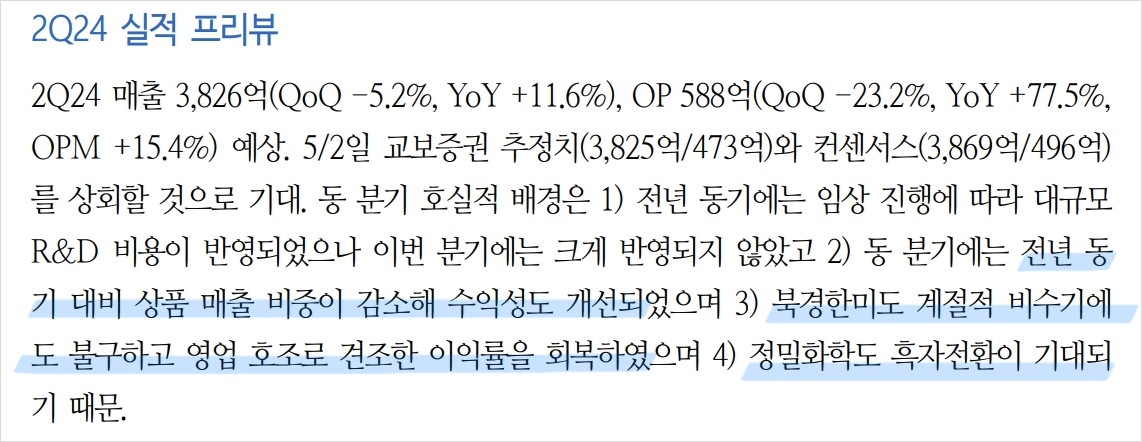 한미약품은 2024년 2분기에도 좋은 실적을 기록할 것으로 보임. 주요 R&D 프로젝트인 LA트리아와 MASH 치료제의 임상이 순조롭게 진행 중이며, 북경한미와 정밀화학 사업부의 성장도 지속되고 있음. 특히 북경한미의 영업 호조가 두드러짐. 또한, 2024년 전체 매출과 영업이익이 각각 1조 6,441억 원과 2,658억 원으로 예상되어 실적 향상이 기대됨. 미국 1상 임상 결과는 내년 초 발표될 예정.