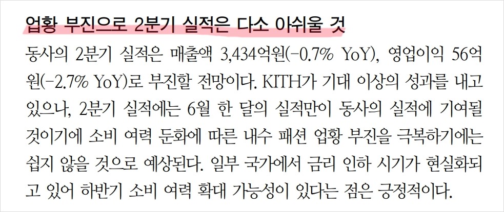 한섬은 최근 KITH Seoul의 성공적인 출점과 함께 소비자들의 이목을 끌고 있음. 특히, KITH Seoul은 오픈 이후 매일 오픈런이 일어날 정도로 높은 인기를 끌고 있으며, 예상 매출액을 초과하는 성과를 내고 있음. 시스템 브랜드의 파리 플래그십 스토어 오픈으로 인해 해외 매출 성장과 브랜드 인지도 확장이 기대됨.