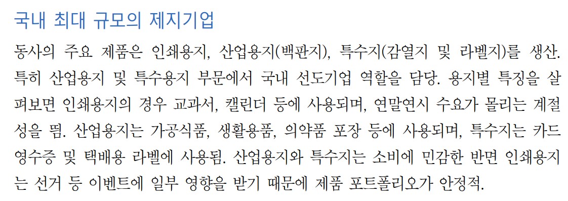 한솔제지는 국내 최대 규모의 제지기업으로, 인쇄용지, 산업용지(백판지), 특수지(감열지 및 라벨지)를 생산함. 특히 산업용지와 특수지 부문에서 선도기업 역할을 담당하며, 교과서와 캘린더 등 인쇄용지는 연말연시에 수요가 집중되는 특성을 가짐. 산업용지는 가공식품, 생활용품, 의약품 포장 등에 사용되고, 특수지는 카드 영수증 및 택배용 라벨에 사용됨. 한솔제지의 제품 포트폴리오는 안정적인 편임.