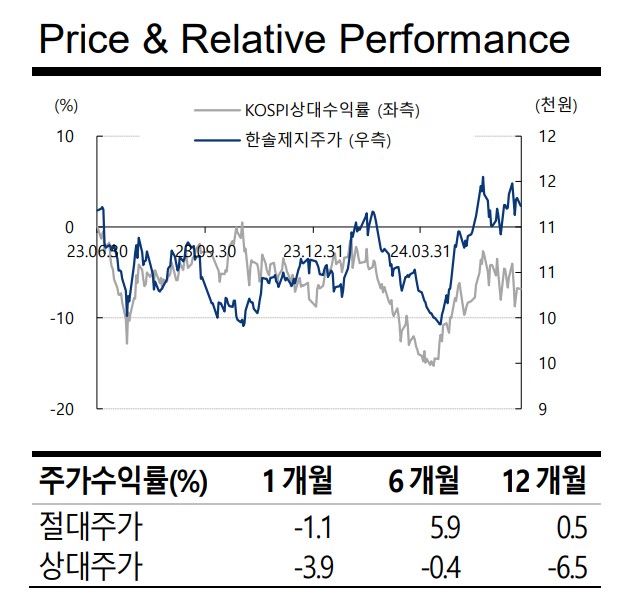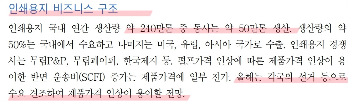 한솔제지는 안정적인 제품 포트폴리오와 국제 시장 진출을 통해 지속적인 성장을 기대할 수 있음. 2024년 선거 시즌을 맞아 인쇄용지 수요가 증가할 것으로 예상되며, 이는 매출 상승에 긍정적인 영향을 미칠 것임. 펄프 가격 상승과 운송비 증가로 인해 제품 가격 인상이 이루어졌으며, 이는 영업이익률 개선에 기여할 것으로 보임.