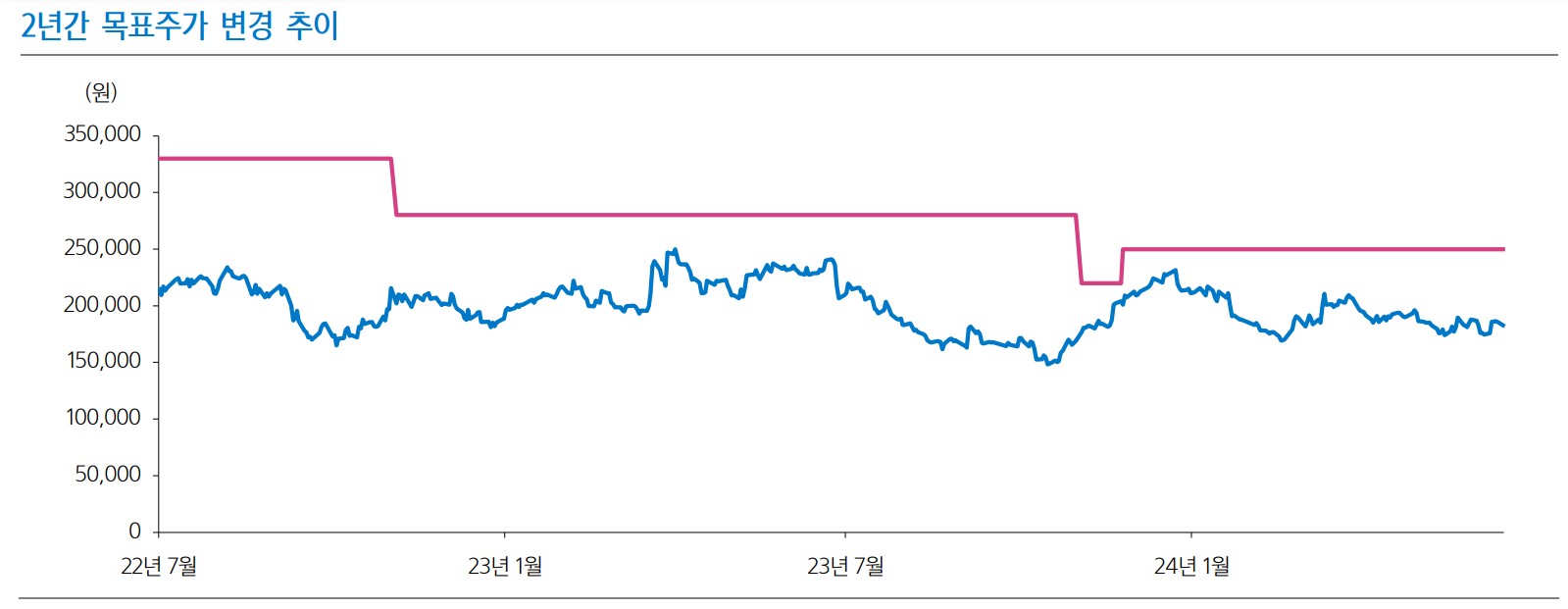 한솔케미칼의 목표주가는 250,000원으로 설정됨. 이는 현재 주가 대비 약 36.8%의 상승 여력을 의미함. 한솔케미칼의 지속적인 성장 가능성을 반영한 목표주가임.