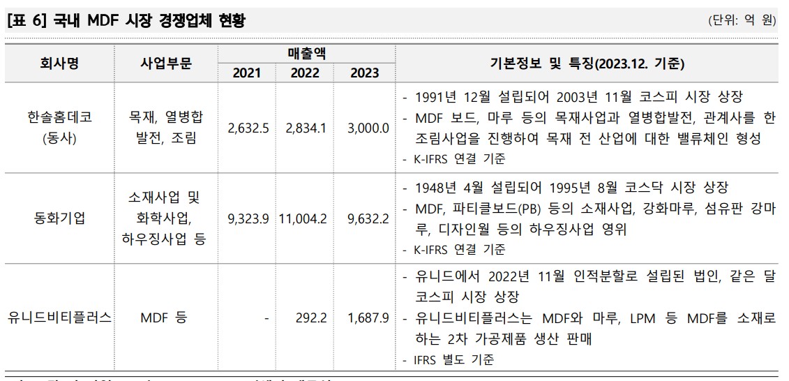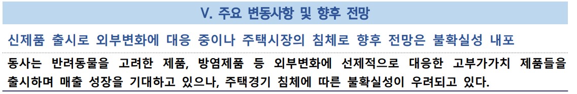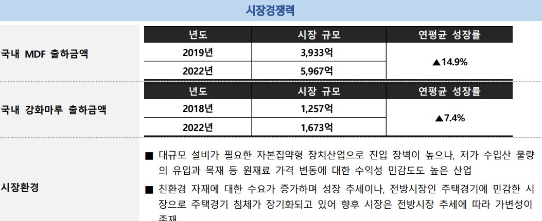 한솔홈데코는 친환경 인테리어 자재 시장에서 강력한 입지를 구축하고 있음. 주요 제품인 MDF와 강화마루는 국내 시장에서 높은 점유율을 차지하고 있으며, 최근에는 방염 기능을 추가한 고기능성 제품을 출시하여 시장 변동성에 대응하고 있음. 또한, 재생원료 사용 비중을 높이고, 탄소중립을 실천 하며 ESG 경영을 강화하고 있음. 친환경 제품과 ESG 경영이 경쟁력의 핵심임.