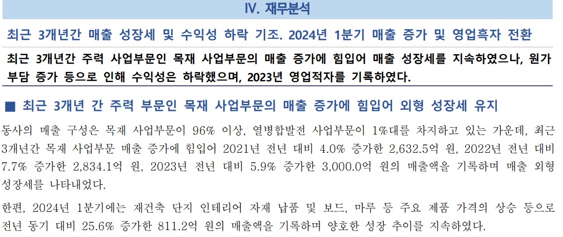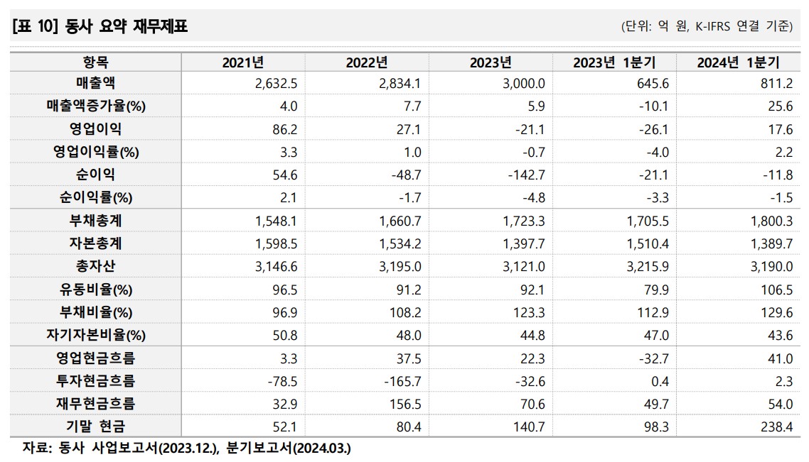 한솔홈데코의 재무 상황은 최근 몇 년간 매출 성장세를 보였으나, 원가 부담 증가로 인해 수익성은 하락했음. 2023년 매출액은 3,000억 원, 영업손실은 21.1억 원을 기록했으며, 2024년 1분기에는 매출액 811.2억 원, 영업이익 17.6억 원으로 흑자 전환함. 부채비율은 129.6%로 다소 높으나, 지속적인 비용 절감과 매출 포트폴리오 개선으로 재무 안정성을 유지하고 있음. 영업이익 흑자 전환이 긍정적 신호임.