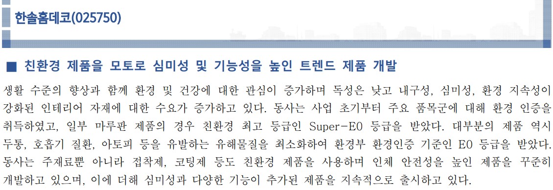 한솔홈데코는 친환경 인테리어 자재 전문기업으로, 방염 기능과 친환경성을 갖춘 고기능성 제품을 통해 시장에서의 입지를 강화하고 있음. 지속 가능한 경영과 ESG 강화를 통해 주가 상승이 기대됨.