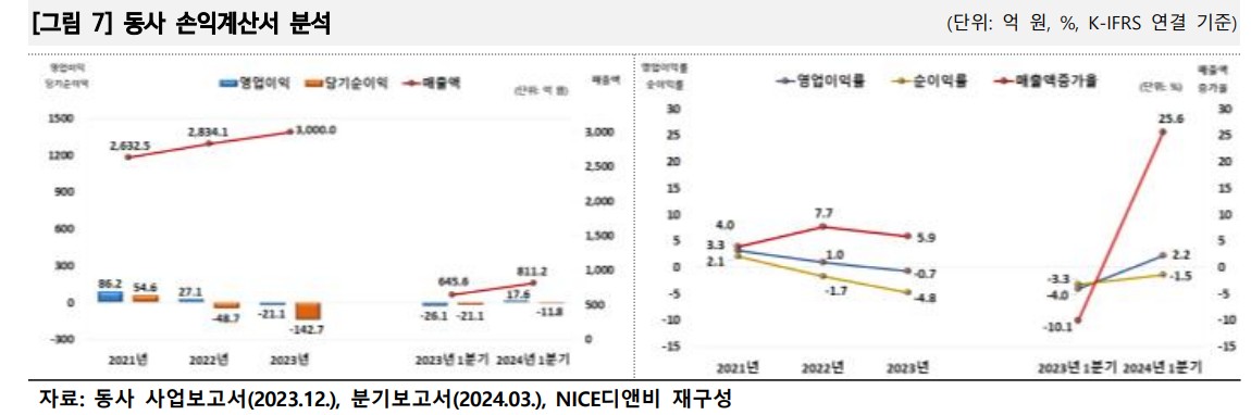 한솔홈데코의 재무 상황은 최근 몇 년간 매출 성장세를 보였으나, 원가 부담 증가로 인해 수익성은 하락했음. 2023년 매출액은 3,000억 원, 영업손실은 21.1억 원을 기록했으며, 2024년 1분기에는 매출액 811.2억 원, 영업이익 17.6억 원으로 흑자 전환함. 부채비율은 129.6%로 다소 높으나, 지속적인 비용 절감과 매출 포트폴리오 개선으로 재무 안정성을 유지하고 있음. 영업이익 흑자 전환이 긍정적 신호임.