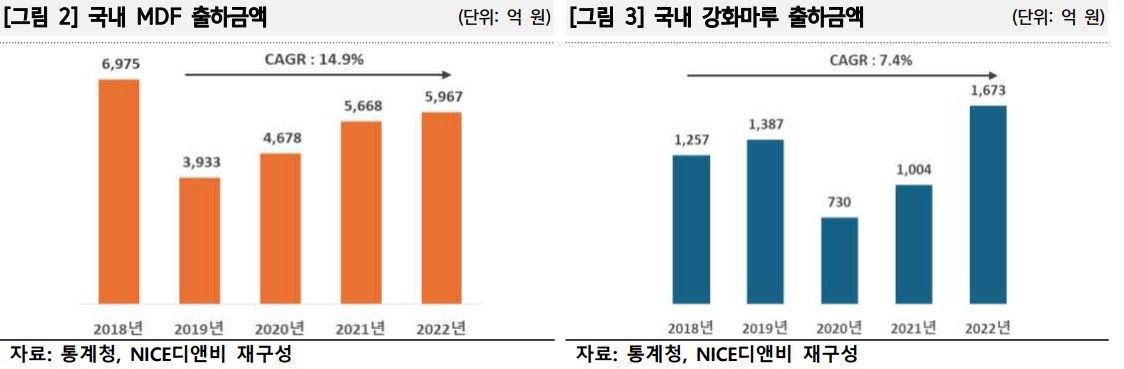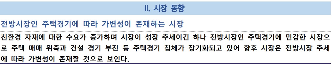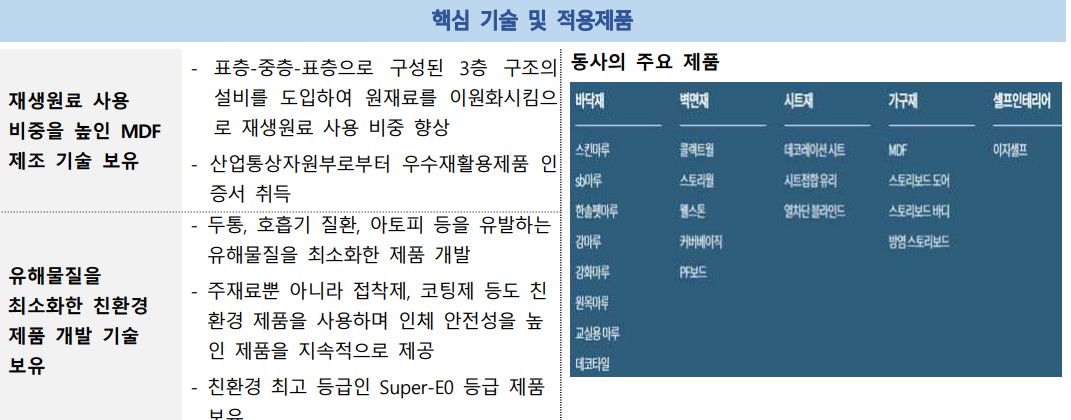 한솔홈데코는 친환경 인테리어 자재 시장에서 강력한 입지를 구축하고 있음. 주요 제품인 MDF와 강화마루는 국내 시장에서 높은 점유율을 차지하고 있으며, 최근에는 방염 기능을 추가한 고기능성 제품을 출시하여 시장 변동성에 대응하고 있음. 또한, 재생원료 사용 비중을 높이고, 탄소중립을 실천 하며 ESG 경영을 강화하고 있음. 친환경 제품과 ESG 경영이 경쟁력의 핵심임.