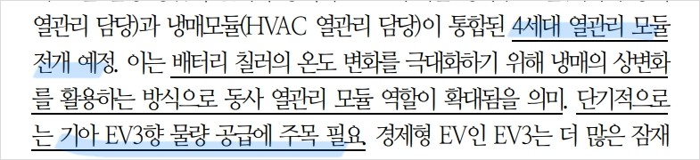 한온시스템은 최근 주요 고객사인 현대차와 기아를 비롯하여 메르세데스-벤츠, BMW 등의 전기차(BEV) 신규 모델에 열 관리 모듈을 공급하기 시작했음. 2024년 하반기부터는 냉각수 모듈과 냉매 모듈이 통합된 4세대 열 관리 모듈을 공급할 예정임. 이는 배터리 칠러의 온도 변화를 극대화하기 위해 냉매의 상변화를 활용하는 방식으로, 한온시스템의 열 관리 모듈 역할이 확대될 것으로 보임.