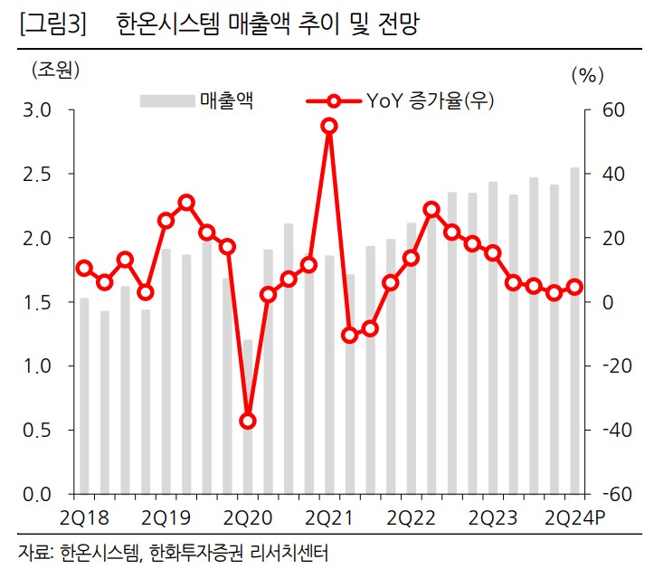 한온시스템은 자동차 부품 제조업체로, 특히 열 관리 시스템에 강점을 보이고 있음. 2024년 2분기 매출액은 전년 동기 대비 4.6% 증가한 2조 5,410억원, 영업이익은 34.1% 감소한 945억원으로 예상됨. 주요 성장 요인은 현대차와 기아 등 주요 고객사향 물량 증가와 단가 회복, 그리고 예상보다 강한 달러화로 인한 긍정적인 환율 효과 등이 있음.