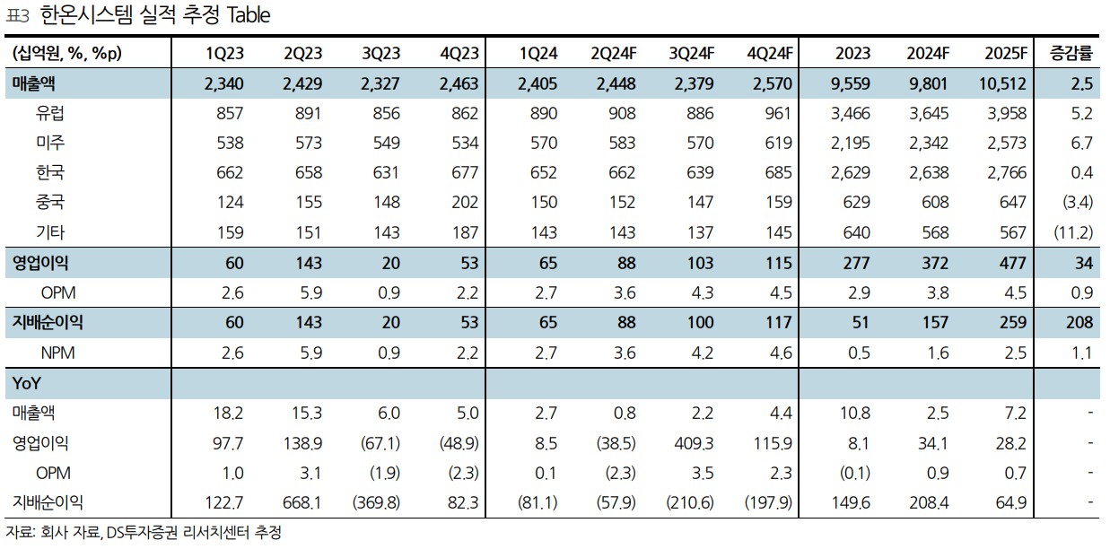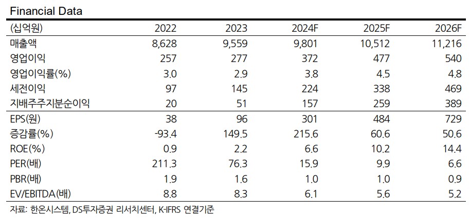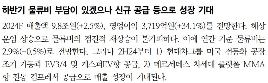 한온시스템은 전기차 시장의 성장과 주요 고객사의 전동화 전략에 따라 안정적인 매출 성장을 기록하고 있음. 2024년 매출액은 9.8조원, 영업이익은 3,719억원으로 예상됨. 유럽 프리미엄 고객사 비중이 지속적으로 확대되고 있음. 전동화 비중 상승으로 대당 납품 단가가 상승하여 수익성 개선이 기대됨.