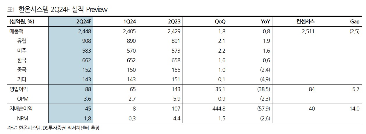 한온시스템은 2분기 매출액 2.4조원, 영업이익 880억원을 기록하며 2분기 최대 매출을 달성할 것으로 예상됨. 전방 수요 둔화와 주요 고객사의 생산량 감소에도 불구하고 매출 성장세 유지. 신규 공급 계약과 전기차 시장 확대가 매출 증가에 기여할 전망. 하반기에는 현대차그룹 미국 전동화 공장 조기 가동과 메르세데스 차세대 플랫폼 MMA향 전동 컴프레서 공급이 기대됨.