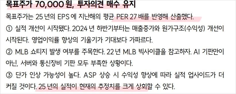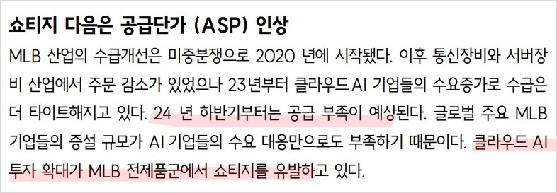 이수페타시스는 최근 클라우드 AI 투자 확대와 글로벌 주요 MLB 기업들의 증설 규모가 AI 기업들의 수요 대응만으로도 부족한 상황에서 공급 부족이 예상됨. 2024년 3분기부터 신공장 가동이 시작되며, 북미 AI가속기 고객사향 매출이 본격화될 것으로 예상됨. 이는 매출 증대와 영업이익 개선에 큰 기여를 할 전망임.