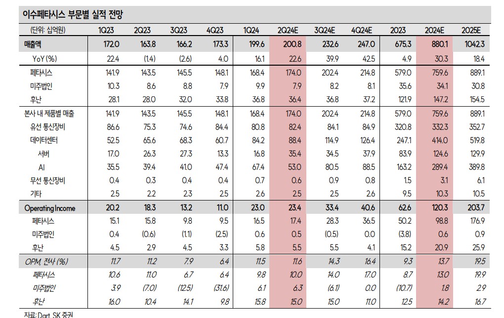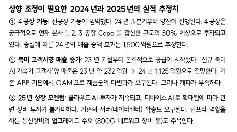 이수페타시스는 2024년 하반기부터 북미 고객사향 매출 증가와 신공장 가동으로 매출과 영업이익이 크게 증가할 전망임. 특히 2024년 3분기부터 신공장 가동이 시작되며, 매출 증액 효과는 약 1,500억 원으로 추정됨. 북미 AI가속기 고객사향 매출은 2023년 232억 원에서 2024년 1,125억 원으로 증가할 것으로 예상됨.