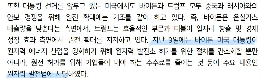 한전기술은 원자력 발전소 설계 및 관리 분야에서 세계적인 경쟁력을 갖추고 있음. 체코 등 여러 국가에서 신규 원전 수주 가능성이 높아지면서 한전기술의 수혜가 예상됨. 특히 체코 두코바니 및 테멜린 지역에서의 원전 건설 사업은 한전기술에게 중요한 기회가 될 것임. 한전기술은 원자력 발전소 설계뿐만 아니라 유지보수 및 성능개선 사업도 활발히 진행 중임. 한전기술의 기술력과 경험은 경쟁사들보다 우수하다고 평가됨.