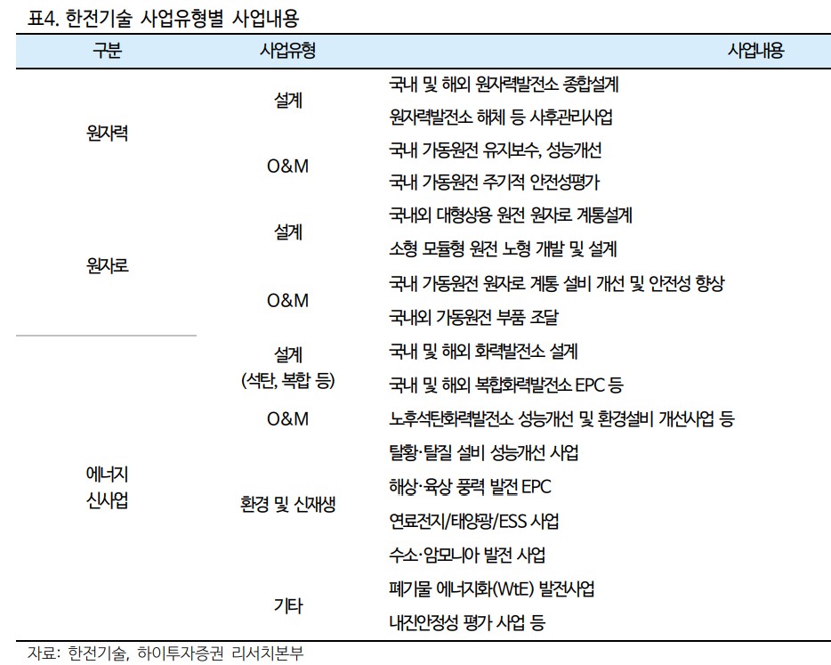 한전기술은 원자력 발전소 설계, 유지보수, 성능개선 분야에서 높은 기술력을 보유하고 있음. 특히, 체코 원전 프로젝트 수주 가능성과 혁신형 SMR 기술개발 참여는 한전기술의 미래 성장을 견인할 주요 요인임. 원전 설계 및 관리 분야에서의 경험과 기술력은 한전기술의 큰 강점임. 또한, 한전기술은 국내외 다양한 프로젝트에 참여하여 꾸준한 매출을 창출하고 있음. 한전기술의 기술력과 프로젝트 경험은 경쟁사들보다 우수하다고 평가됨.
