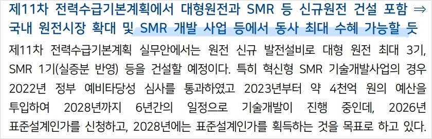 최근 한전기술은 체코 두코바니 및 테멜린 원전 프로젝트에 참여하고 있으며, 우선협상대상자 선정 결과가 곧 발표될 예정임. 이 프로젝트는 약 30조 원 규모로, 한전기술이 수주에 성공할 경우 유럽 원전 시장에서의 입지를 더욱 강화할 수 있음. 체코 수주 성공 시 폴란드, 네덜란드 등 다른 유럽 국가로의 진출 가능성도 높아짐. 또한, 한전기술은 혁신형 SMR(소형모듈원전) 기술개발 사업에도 주도적으로 참여하고 있음. SMR 기술은 미래 원전 시장의 핵심 기술로 평가받고 있음. 이러한 이슈들은 한전기술의 미래 성장 가능성을 높이는 중요한 요소임.