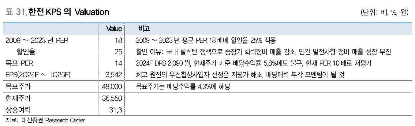 한전KPS의 목표주가는 60,000원임. 이는 현재 주가 대비 32% 상승 여력이 있음. 매수 의견을 유지함.