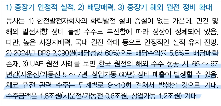 최근 한전KPS는 국내외에서 다양한 프로젝트를 수주하며 실적 개선의 기대감을 높이고 있음. 특히, 국내 주요 전력 설비와의 유지보수 계약 연장을 통해 안정적인 매출 기반을 유지하고 있으며, 신재생에너지 분야에서도 새로운 프로젝트를 수주하며 성장 가능성을 높이고 있음. 해외 시장에서도 신규 계약이 활발하게 이루어지고 있어 향후 실적 개선이 기대됨.